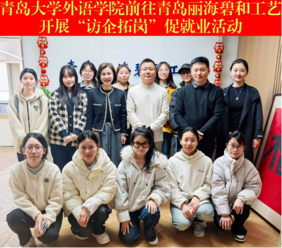 为搭建全方位校企合作平台,拓宽学生就业途径,3月28日下午,外语学院党委副书记于苗、团委副书记张淑敏、辅导员王紫琪一行带领学生代表一同深入走访青岛丽海碧和工艺有限公司。