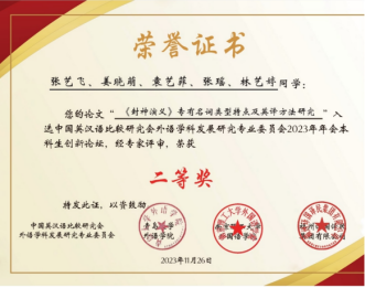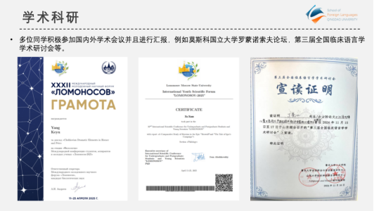 学术科研方面,多位学生积极参加国内外学术会议并且进行汇报,例如莫斯科国立大学罗蒙诺索夫论坛,第三届全国临床语言学学术研讨会等。在优秀毕业论文评选中,1人获得英语系优秀毕业论文;4人获得外语学院优秀毕业论文;2人的毕业论文推荐参评校级优秀毕业论文。学生的大创相关论文《〈封神演义〉专有名词类型特点及英译方法研究 》入选中国英汉语比较研究会外语学科发展研究专业委员会2023年年会本科生创新论坛并获二等奖;也有学生拥有软件著作权。