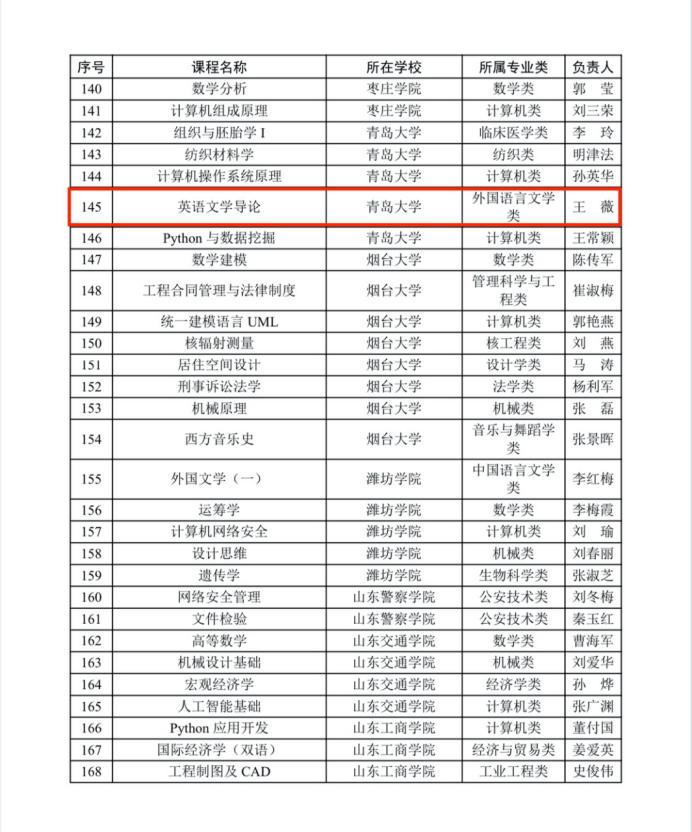 近日,山东省高等教育学会公布了2025年山东省智慧课程拟认定名单,我院王薇教授担任负责人的《英语文学导论》课程成功获批。此次全省共评选确定200门课程为山东省首批智慧课程,青岛大学5门课程获批。