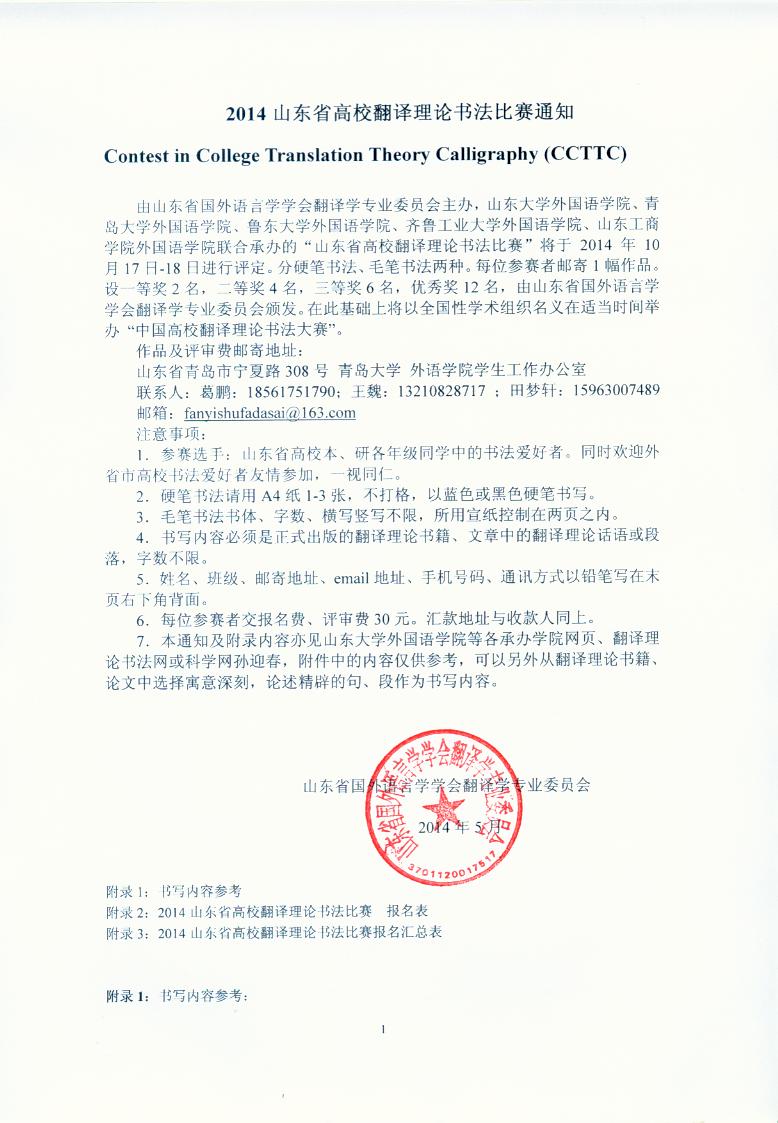 由山东省国外语言学学会翻译学专业委员会主办,山东大学外国语学院、青岛大学外国语学院、鲁东大学外国语学院、齐鲁工业大学外国语学院、山东工商学院外国语学院联合承办的“山东省高校翻译理论书法比赛”将于2014年10月17日-18日进行评定。分硬笔书法、毛笔书法两种。每位参赛者邮寄1幅作品。设一等奖2名,二等奖4名,三等奖6名,优秀奖12名,由山东省国外语言学学会翻译学专业委员会颁发。在此基础上将以全国性学术组织名义在适当时间举办“中国高校翻译理论书法大赛”。