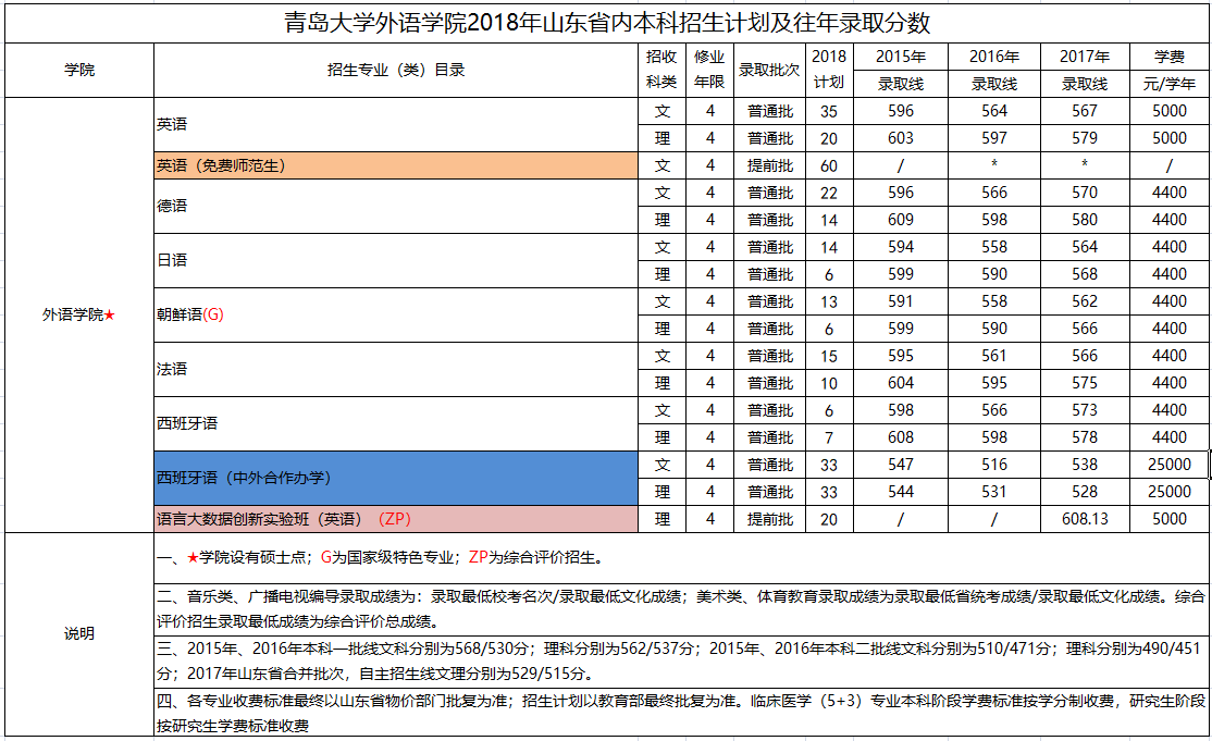 外语学院2018年山东省内本科生招生计划及往年录取分数线
