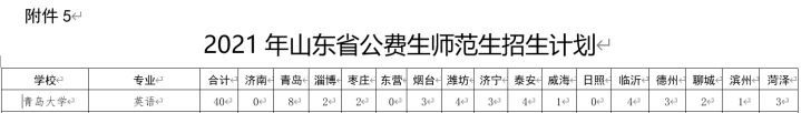 全省安排公费师范生招生计划5000人。其中,青岛大学英语(师范类)专业在全省招收公费师范生40人,其中青岛地区8个,烟台3个,潍坊4个。详见: